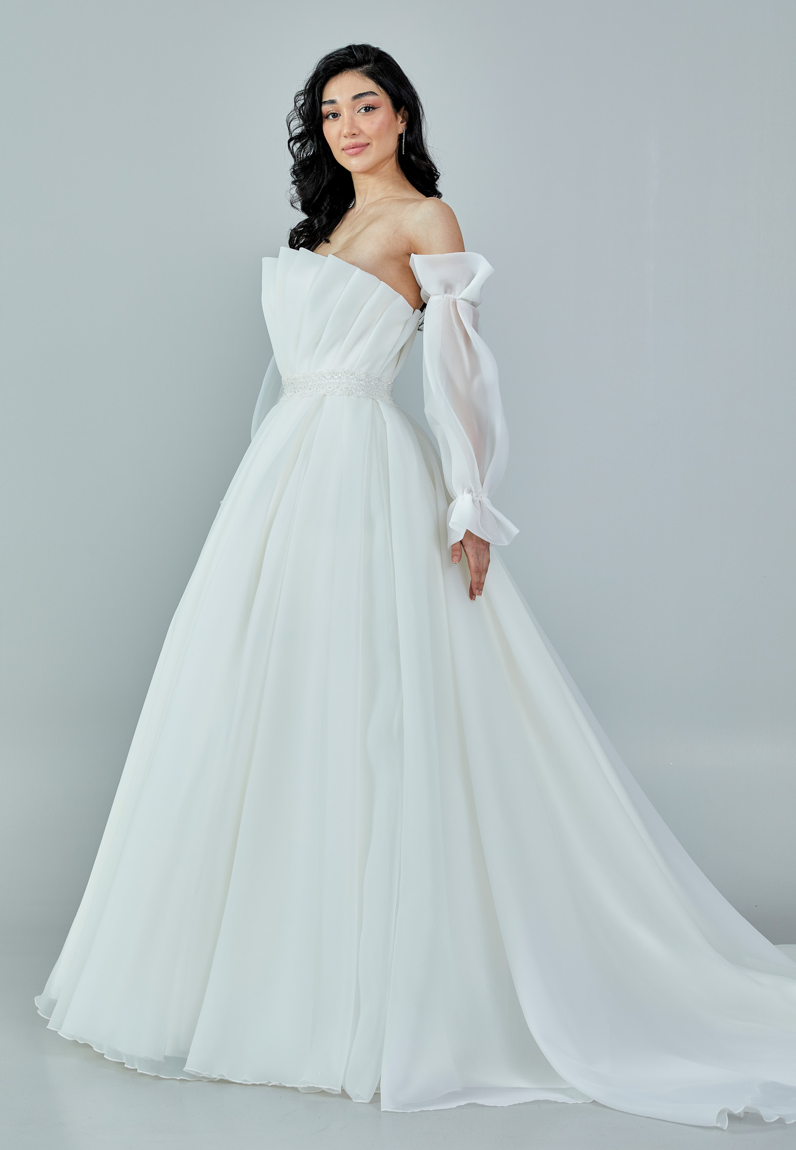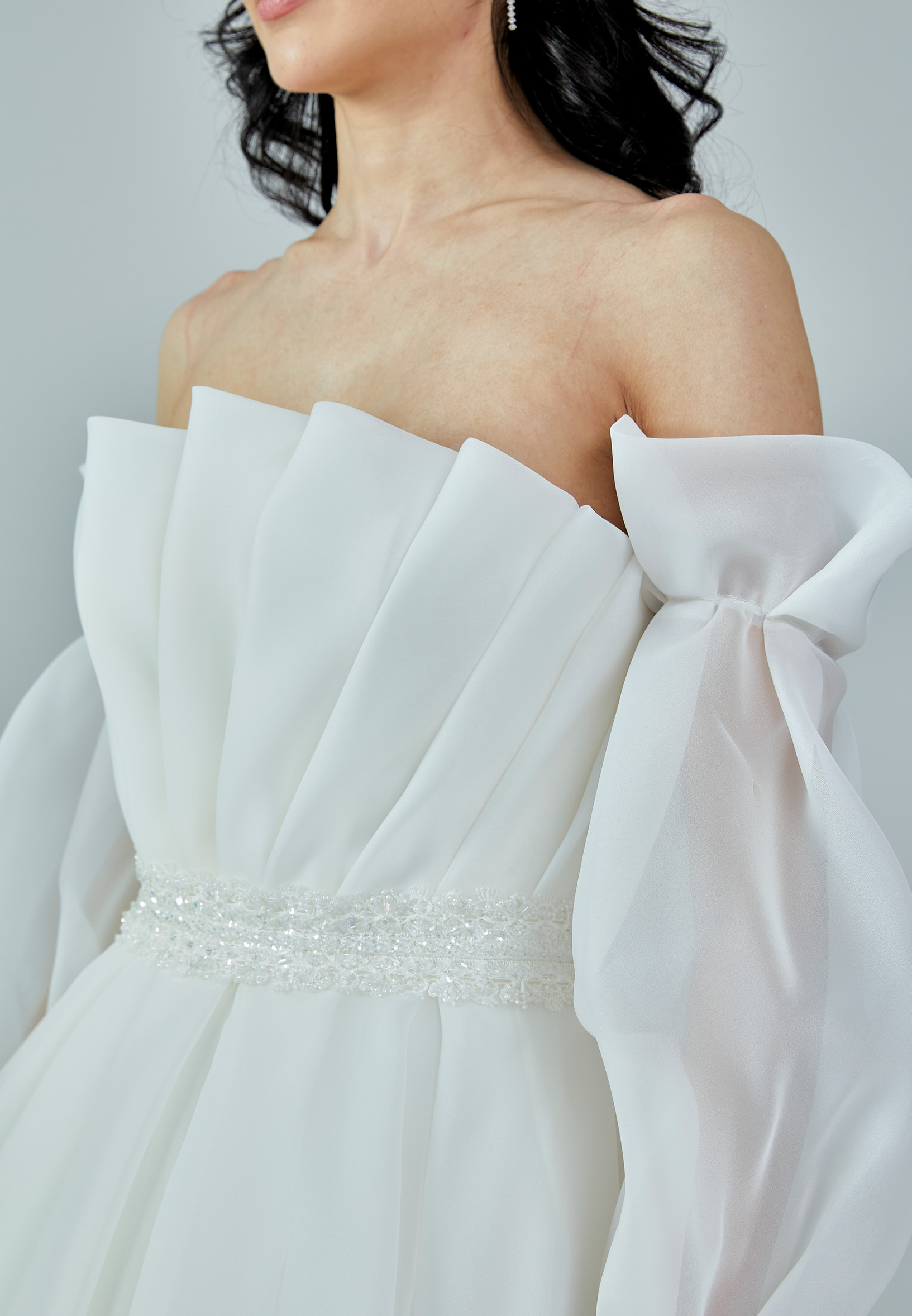 Details: Structured pleated bodice, pearl-beaded waistband, sheer volume sleeves