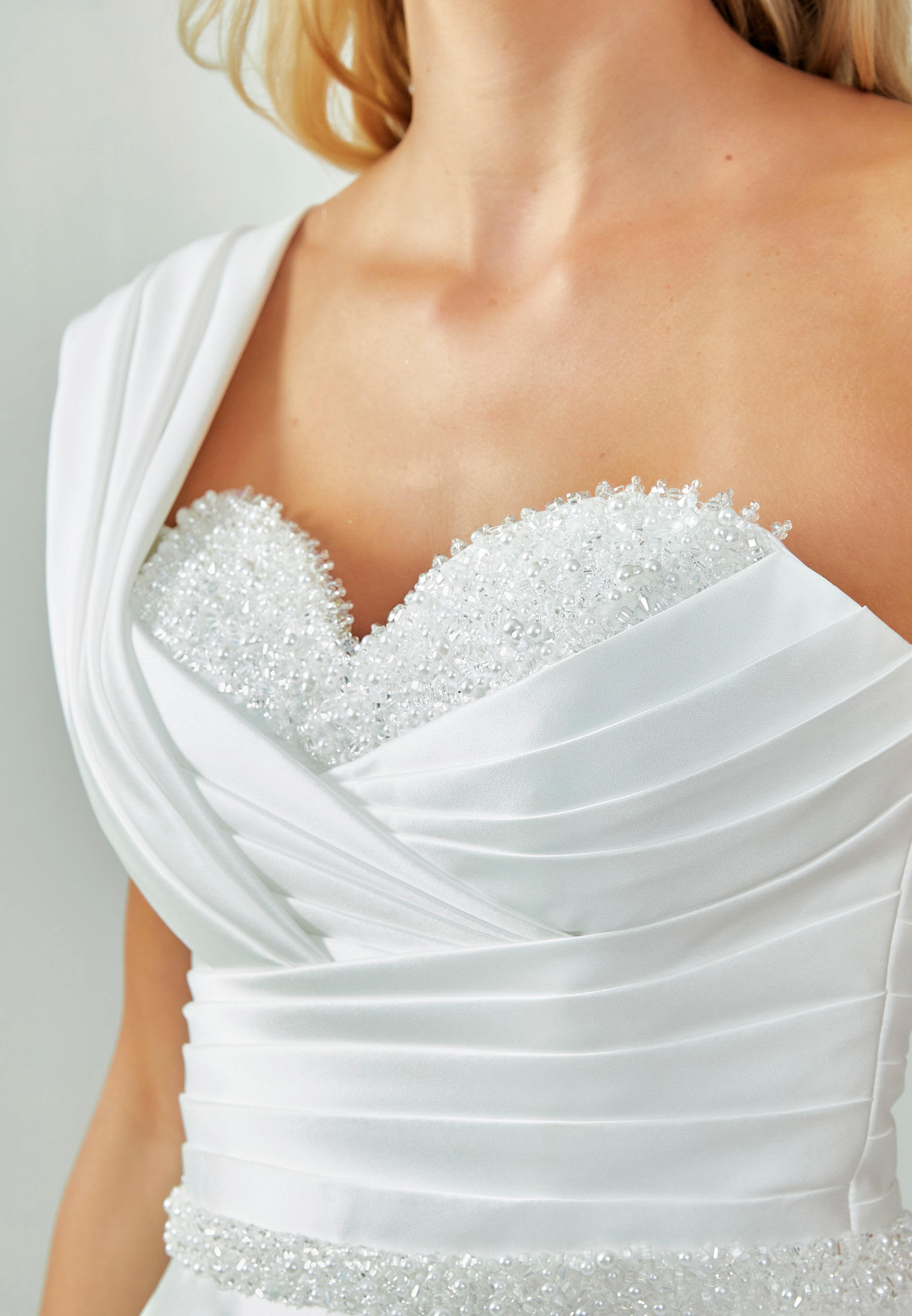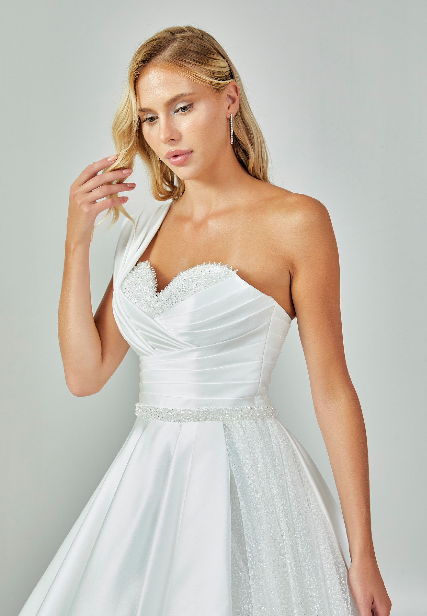 Neckline: Sweetheart with asymmetrical draped shoulder