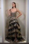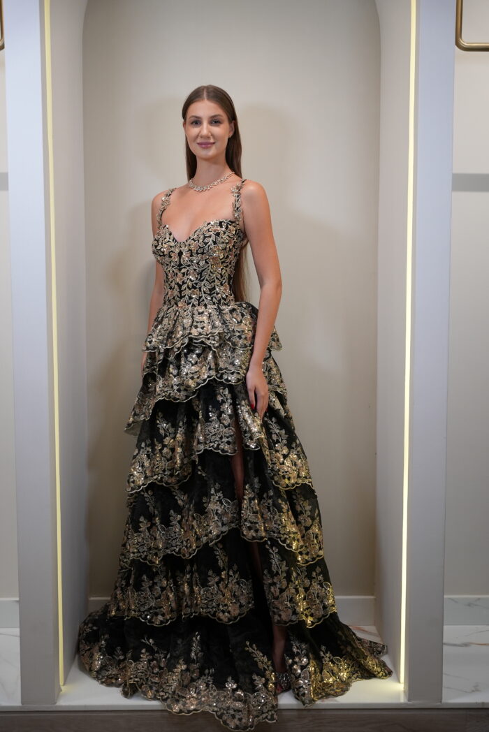 Step into luxury and sophistication with this black and gold couture gown, featuring exquisite floral embroidery throughout. The structured bodice with delicate straps enhances the feminine silhouette, while the layered tiered skirt creates movement and drama with every step.