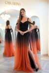 The flowing tulle skirt transitions seamlessly from deep black into fiery orange, creating a dramatic ombré effect that captures the essence of sophistication and bold style. A high side slit adds allure and ensures graceful movement with every step.