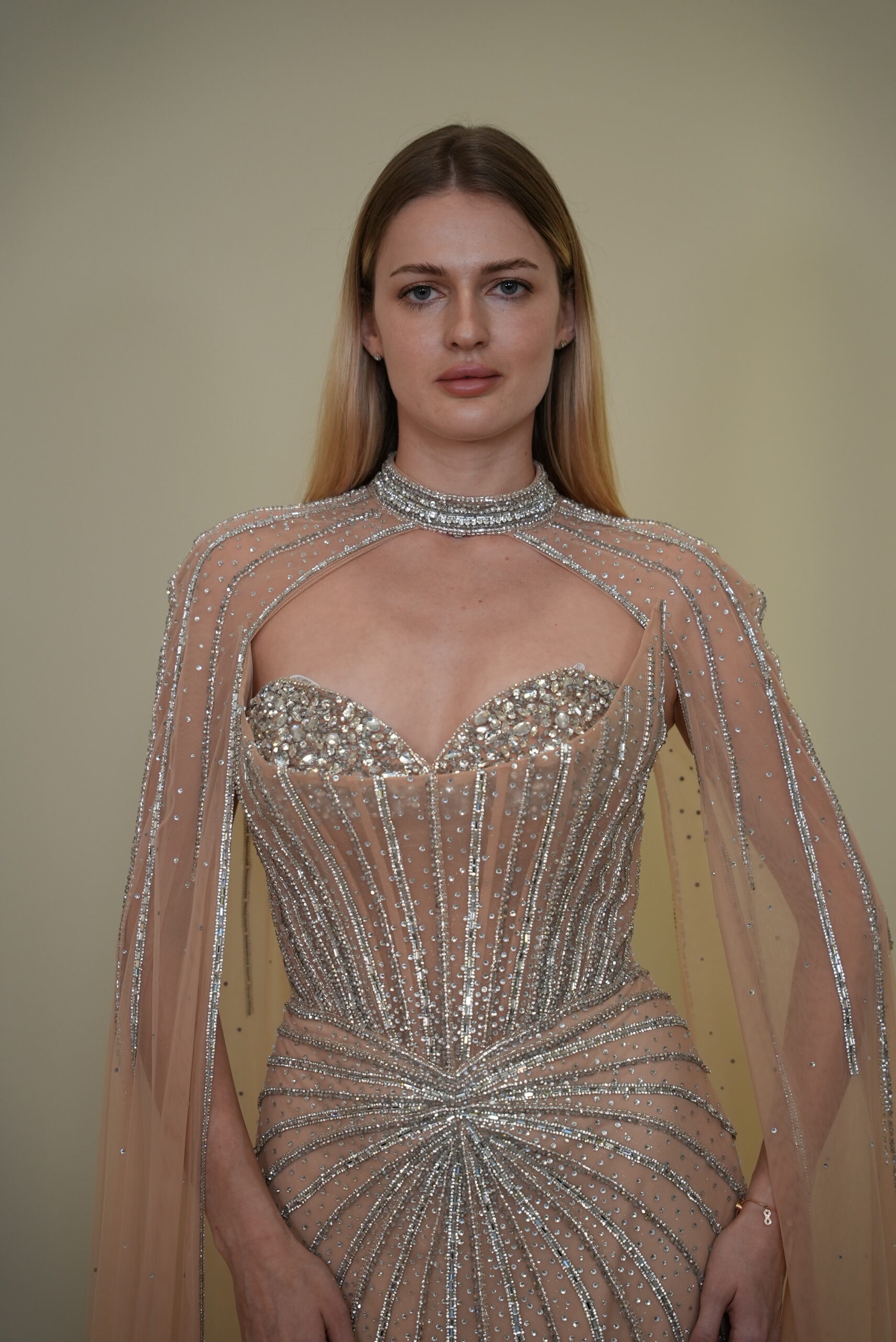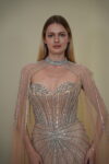 Crystal Corset Evening Gown with Detachable Cape in Nude Beige | RTW74