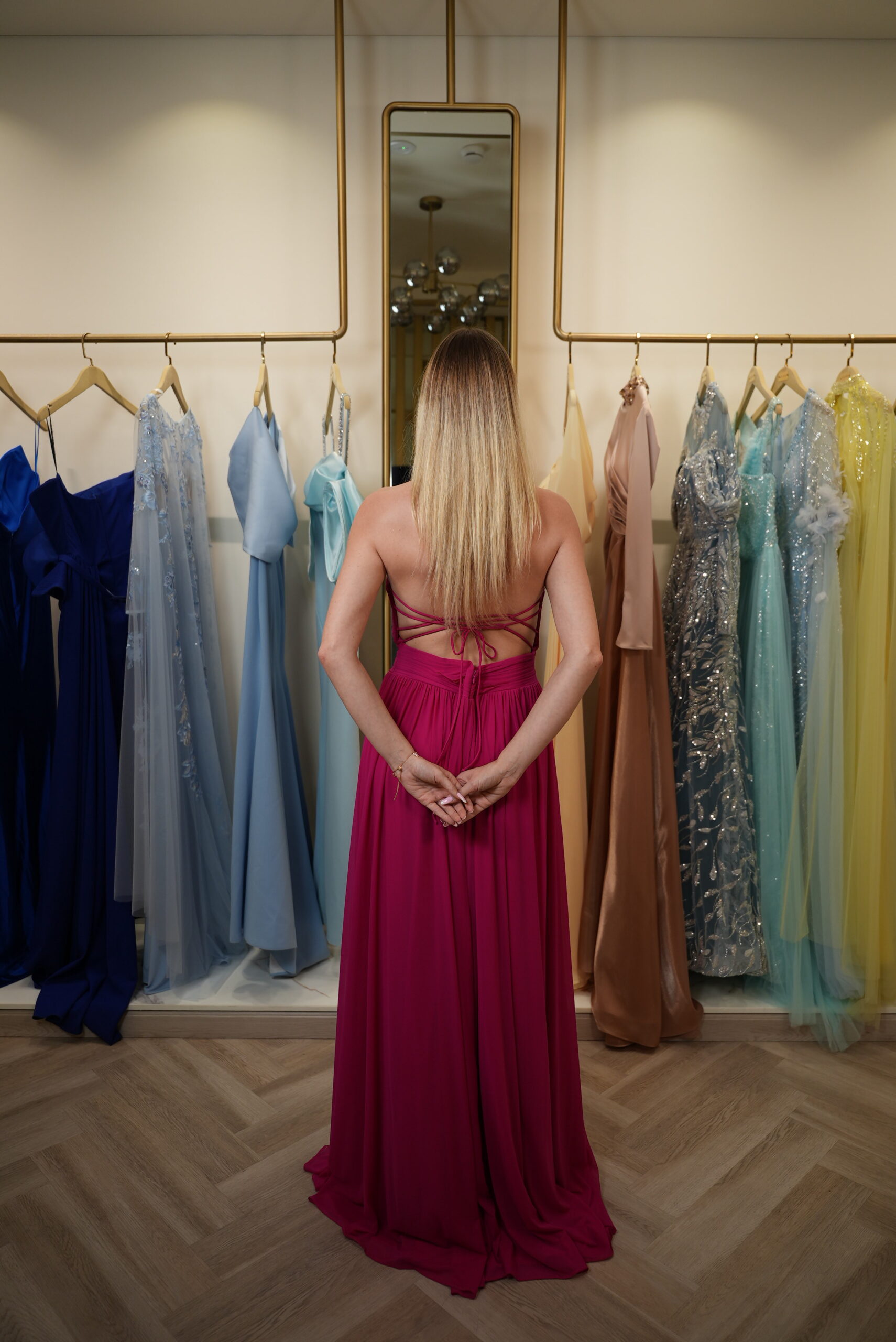 Vibrant and modern, this gown celebrates confidence through color and cut. The ruched sweetheart bodice sculpts a feminine silhouette, while the halter strap adds structure and draws attention to the shoulders and collarbone. A cascading chiffon skirt falls gracefully to the floor, with a high slit lending a sultry edge. The fuchsia hue makes a statement in any setting, from black-tie galas to destination weddings, ensuring the wearer commands attention with sophistication. This gown is perfect for those who want elegance with a bold touch.