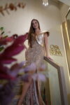 Crafted with precision, the gown highlights bold sculpted shoulders and a pleated bodice that accentuates the waist. The skirt cascades with intricate golden beadwork and sequins, finished with a daring front slit. A show-stopping piece perfect for red carpets, galas, and high-fashion soirées.