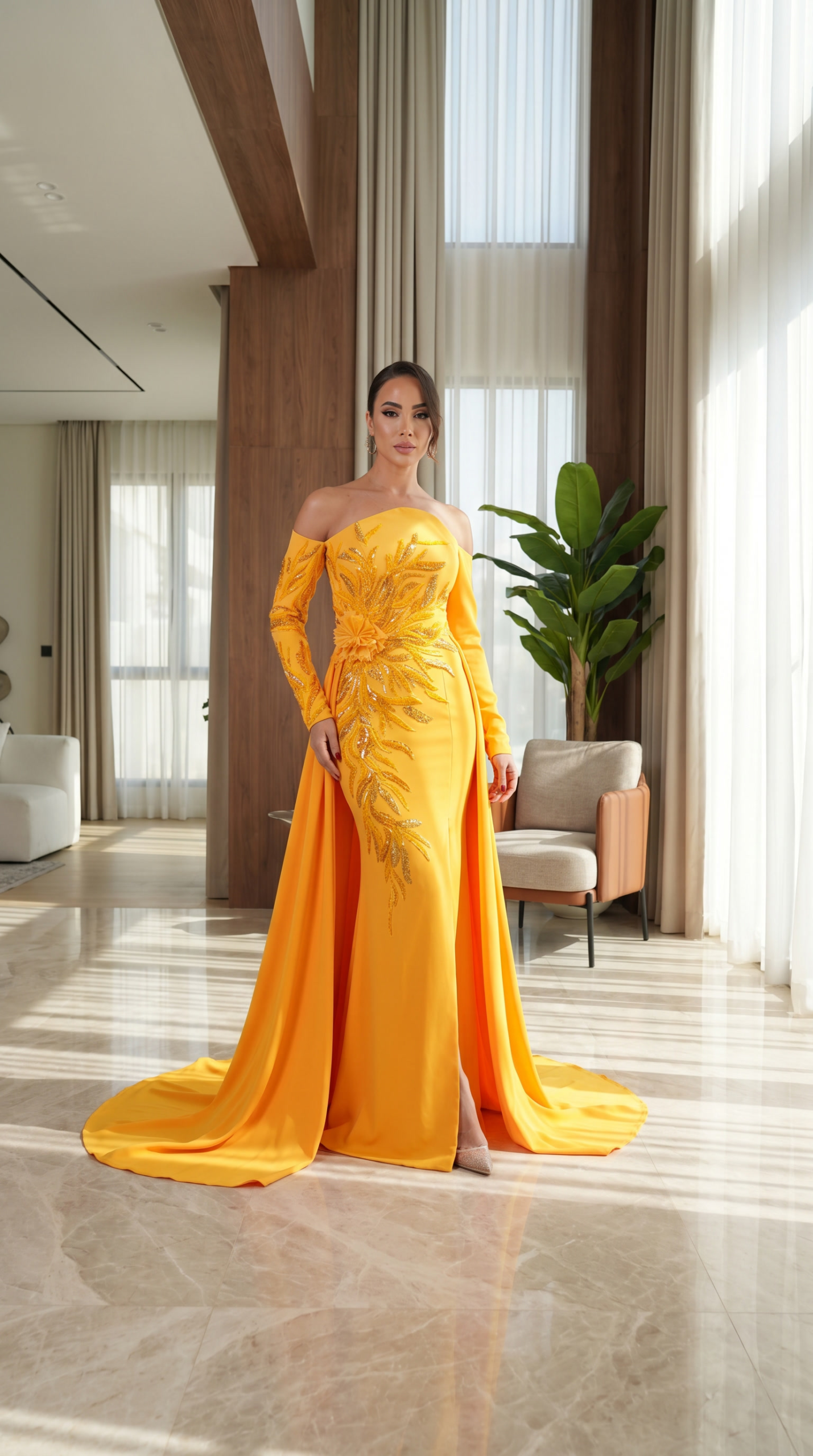 Be the first to review “Golden Yellow Off-the-Shoulder Embroidered Gown” Cancel reply