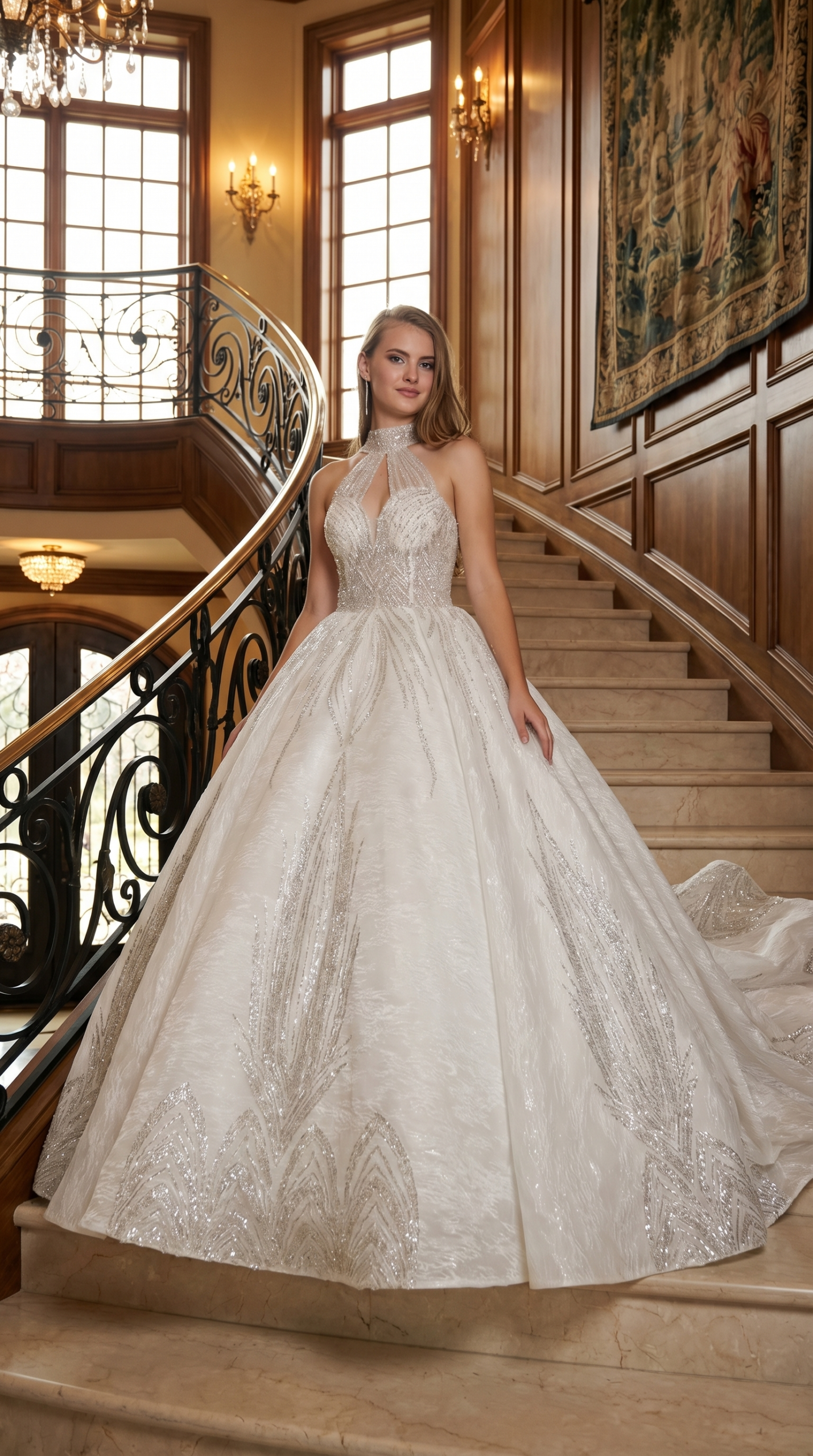 Architectural halter gown with a keyhole neckline and majestic sunburst-patterned crystal embroidery.