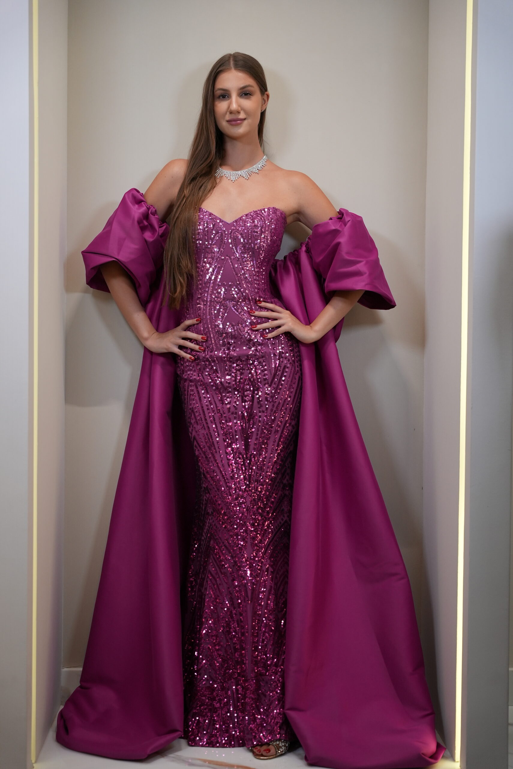 Magenta Strapless Sequin Gown with Detachable Sleeves & Cape | RTW37