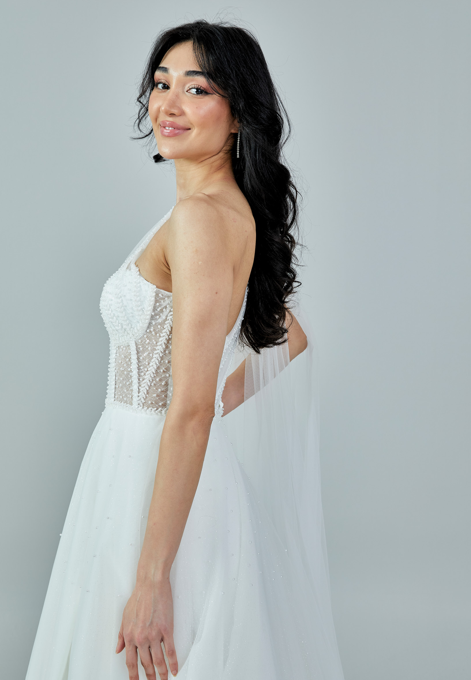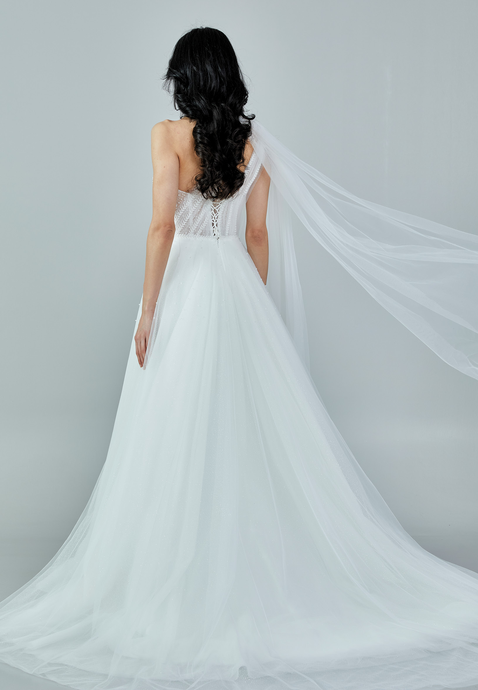 A creation for the modern bride who commands attention effortlessly. The gown’s design flows with architectural precision, its translucent corset and soft tulle layers shimmering subtly under the light. Every detail — from the beaded boning to the asymmetrical neckline — speaks to craftsmanship that bridges classic bridal artistry with contemporary flair.