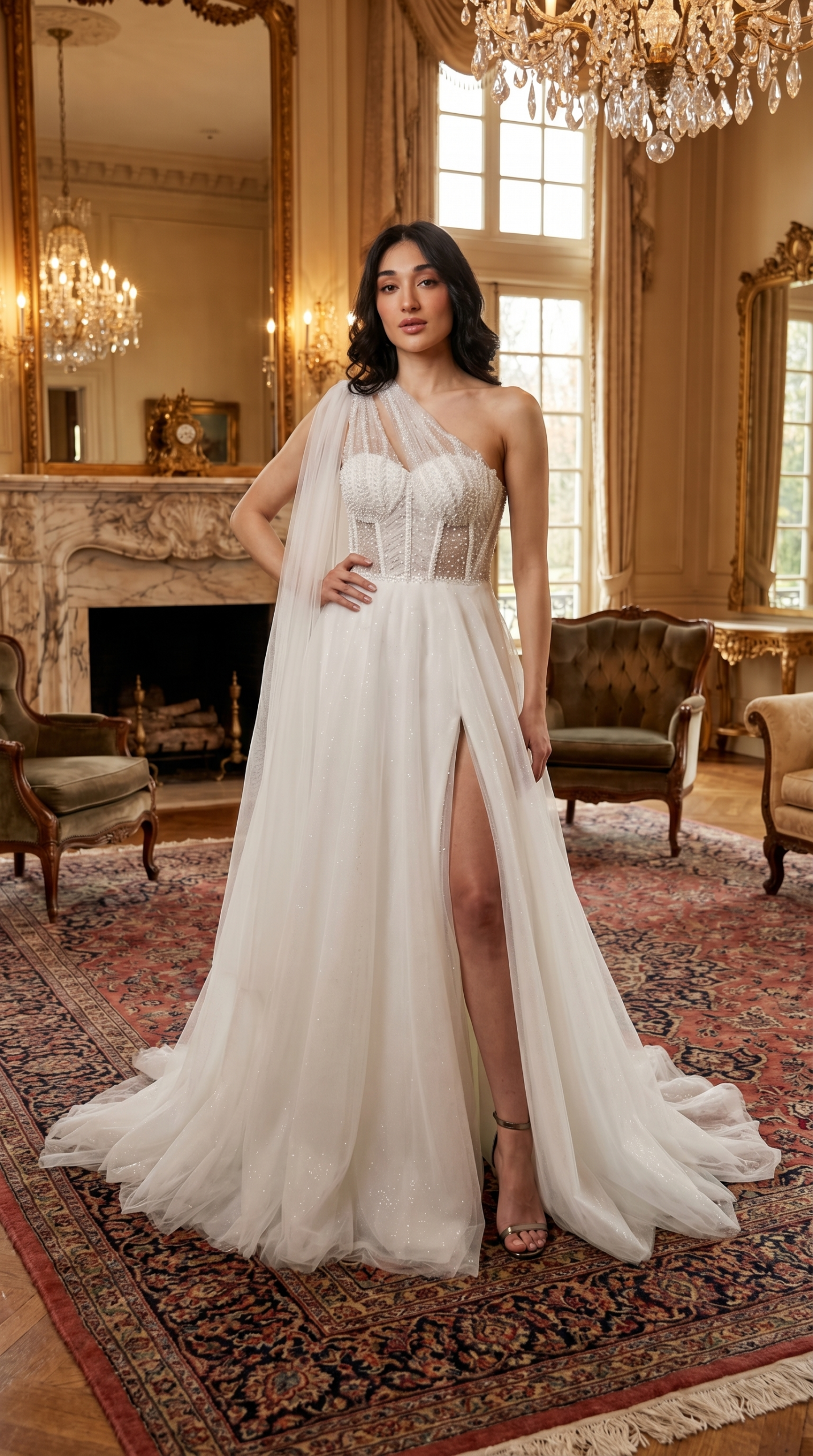 Glamorous one-shoulder bridal gown with pearl-embellished corset and a daring side slit.