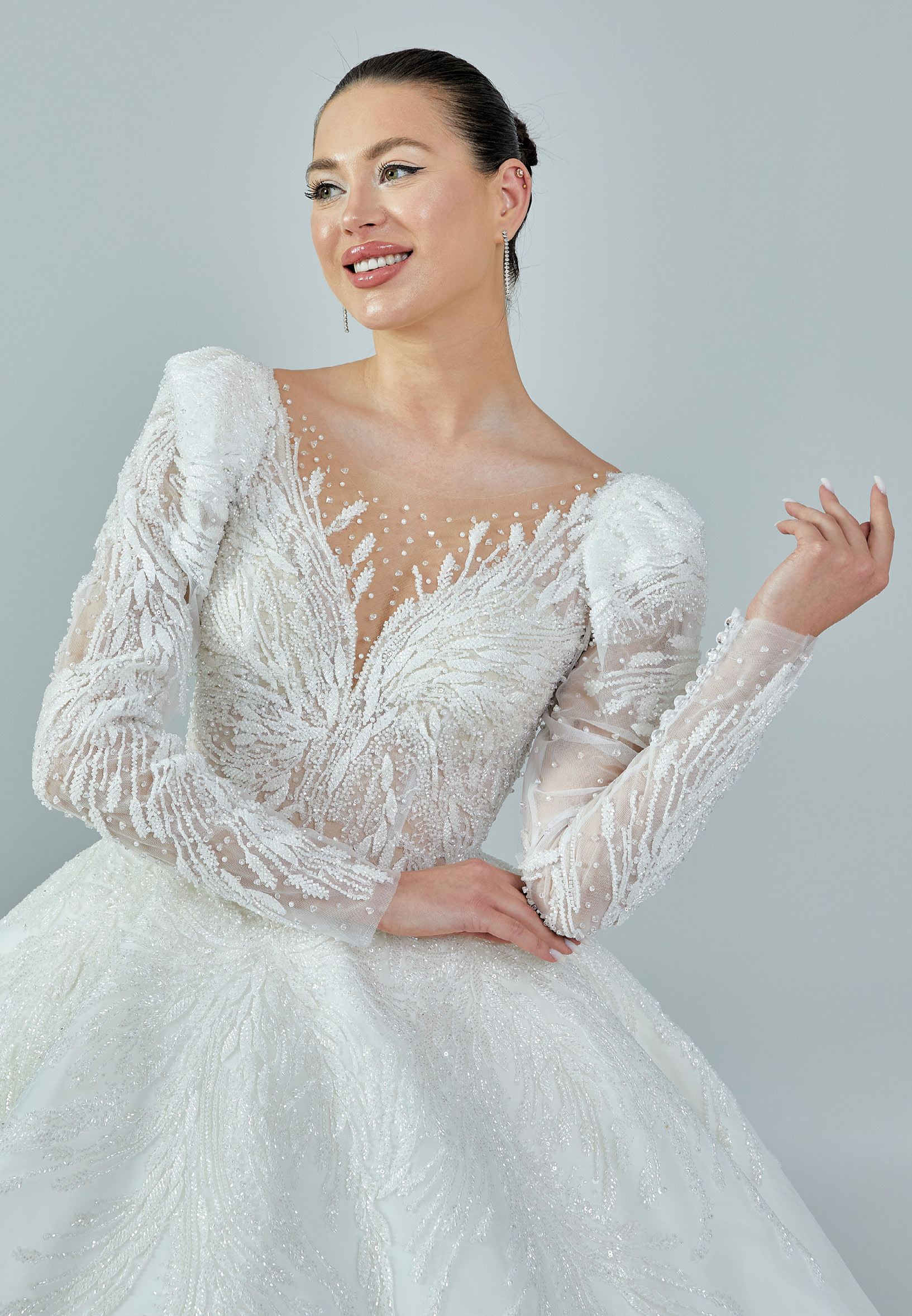 Designed for the bride who dreams of a grand entrance, this gown is pure opulence refined. Every inch shimmers subtly under the light, balancing power and softness in perfect harmony. The deep illusion neckline enhances the décolletage with grace, while the sweeping skirt embodies the artistry of traditional couture reimagined for the modern bride.