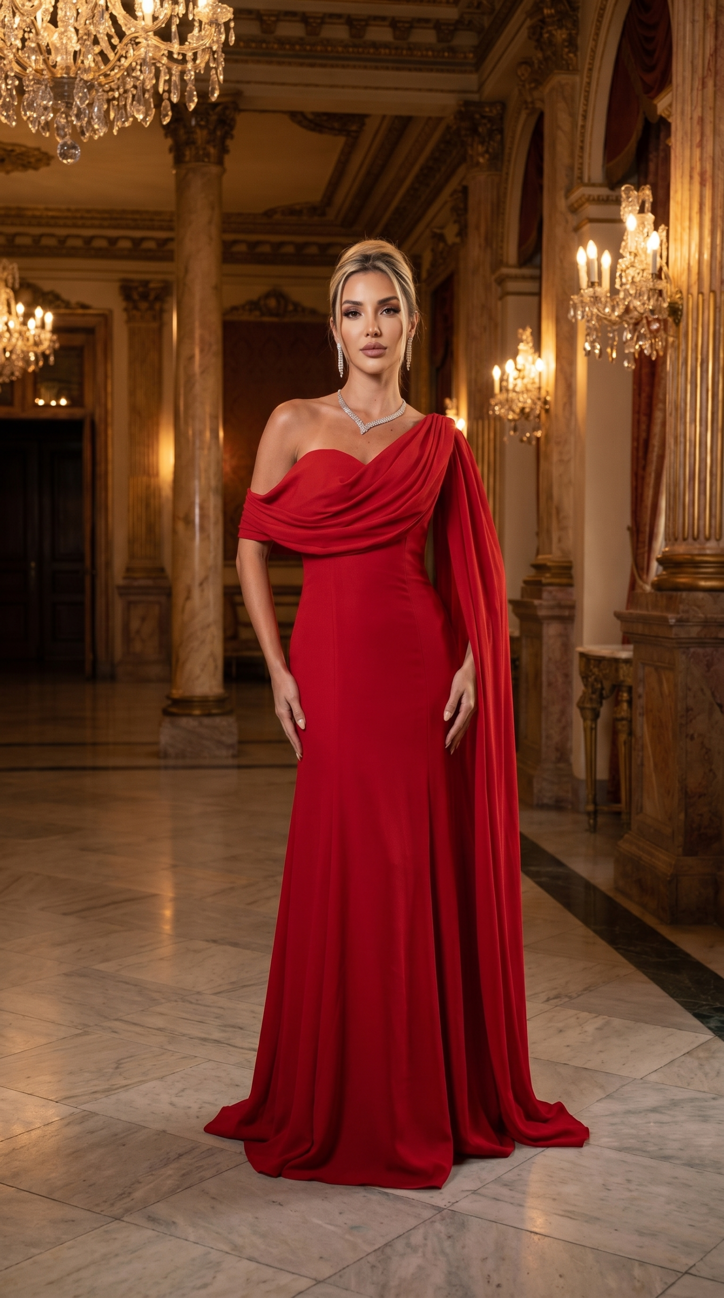 Vibrant scarlet red one-shoulder gown with a draped cowl bodice and integrated floor-length cape.