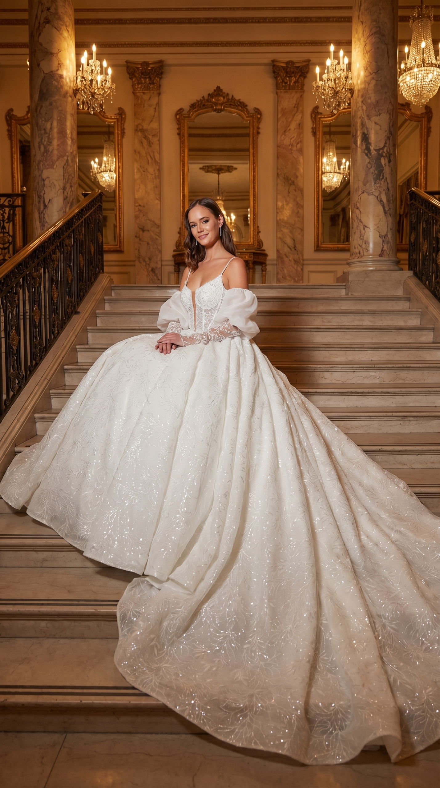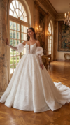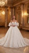 Embody royal elegance on your special day with this majestic sparkling ball gown. Designed to create a breathtaking silhouette, this gown combines traditional bridal romance with contemporary luxury details. The shimmering floral lace catches every light, ensuring you glow from the walk down the aisle to the final dance.