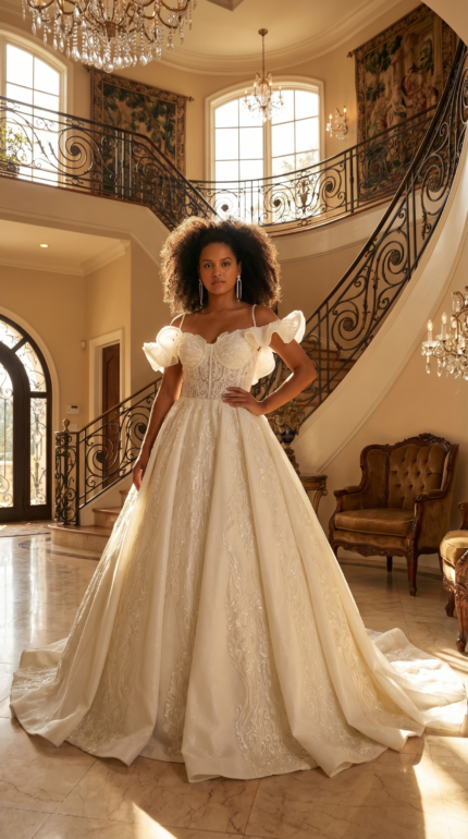 Shimmering Lace Ball Gown with Ruffled Organza Sleeves